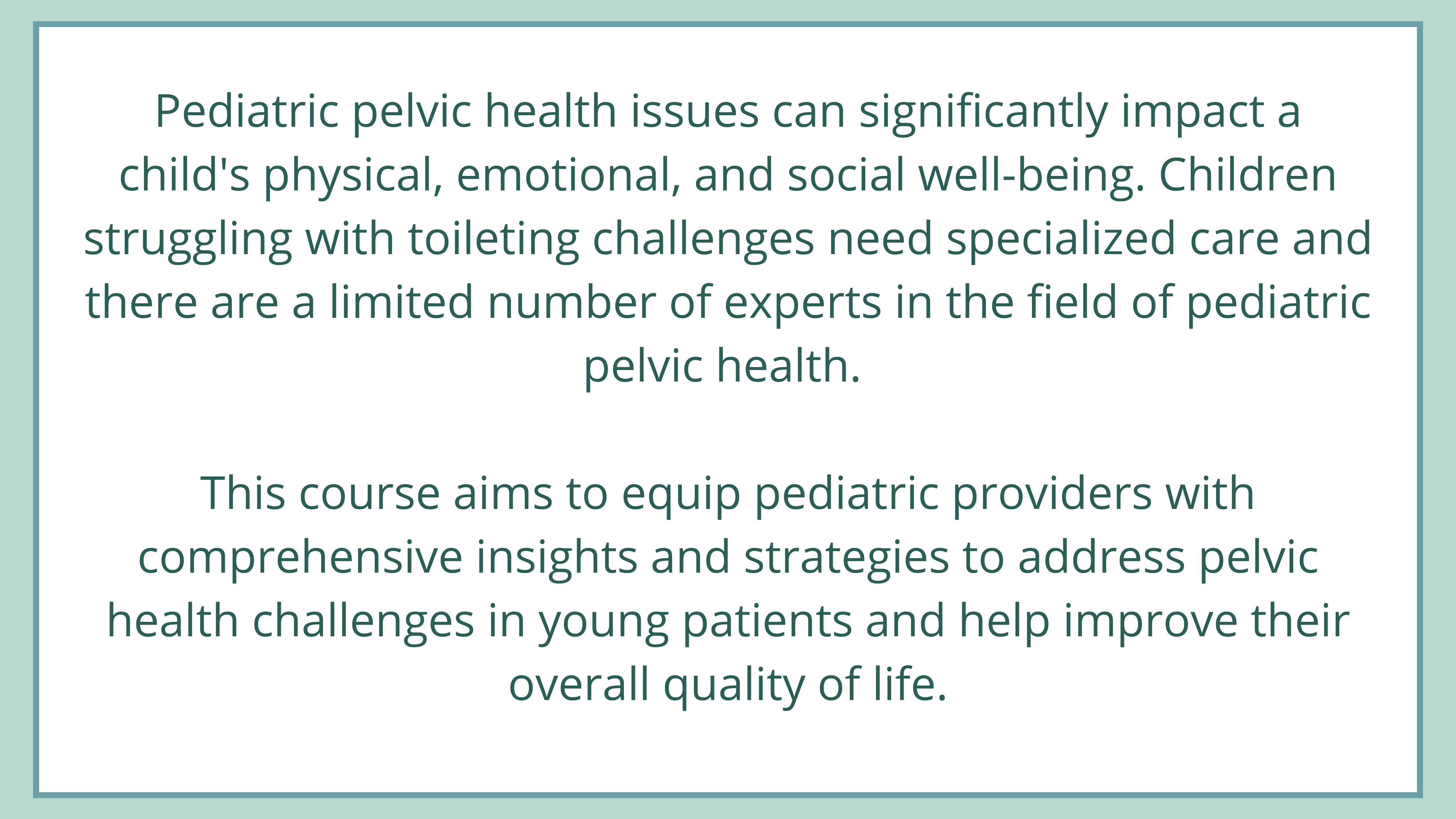 Dr. Caitlin is driven by a mission to help children being challenged in keeping their underwear clean and dry, while also promoting access and awareness of pediatric pelvic health services.